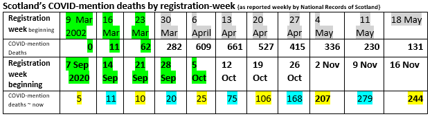 “In Scotland’s second wave, COVID-19 deaths by registration-week (see Table) were trebling fortnightly between the weeks beginning 7 September and 19 October [running rate of 3.3 that is: {10+20+25+75+106}/{5+11+10+20+25}; but – thankfully – the rate of increase shows early signs of having moderated (compare recent yellow shading; also turquoise turquoise). Scotland’s COVID-mention deaths in the registration-weeks beginning 19th October to 9th November were less-than-doubling per fortnight [running rate of 485/274 = 1.8] and the registration-week beginning 16 November has seen the first decrease in Scotland’s COVID-mention deaths.