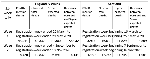 “My second table contrasts 11 weeks of wave 1 versus wave 2 for England and Wales; and for Scotland. The periods are defined slightly differently because the Office for National Statistics definition of registration-week diverges from the harmonized definition adopted by National Records of Scotland. Even so, I’ll the two second waves better next week. Slight mis-alignment between nations does not alter the key finding that, on both sides of the border, excess deaths in wave 2 are, as yet, fewer than the number of COVID-mention deaths< By contrast, excess deaths in wave 1 greatly exceeded (by about 25%) each country’s tally of COVID-mention deaths.