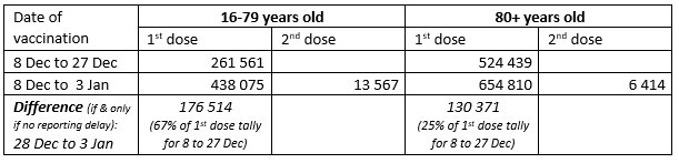 “Second doses were administered by 3 January 2021 for 5.2% of those aged 16-79 years who were reported to have received their 1st dose during 8 to 27 December. However, only those who received their 1st dose during 8th to 13th December 2020 (first six days out of the 20 days from 8 to 27 December, at most 30% (78 500 to nearest 100), would have been pre-scheduled to receive their 2nd dose on or before 3 January 2021.