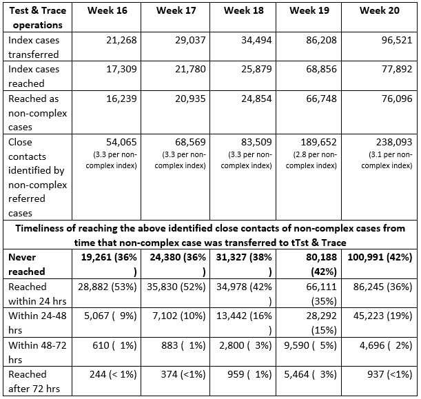 “Other operational aspects have fared less well under the pressure of 20-fold increase work-load for tracers. Overall, 80% of positive persons transferred to Test & Trace have been reached (81% in week 20); and 80% of those reached have provided details for one or more close contacts (85% in week 20). The number of close contacts identified has varied (nearest 100) from 55,100 in week 1, down to 14,100 and 17,400 in weeks 6 and 11 but increased sharply to 86,700 by week 16 and 251,600 in week 20, a 14-fold increase since the Glorious 12th August. Overall, 70% of identified close contacts were reached . . . but only 60% in week 20. Identified close contacts of non-complex index cases are either household contacts or external close contacts. Overall, of 856,000 (nearest 100) close contacts of non-complex index cases, 67% were household contacts (72% in week 20), 57% of whom were asked to self-isolate (56% in week 20) whereas the self-isolation request was made to 65% of external close contacts overall (63% in week 20).