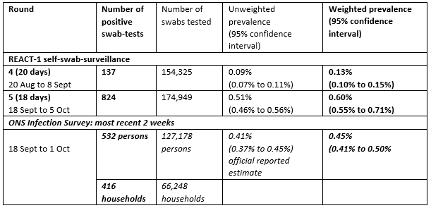 “First, the time periods covered are different, and in particular the REACT-1 results are based on a period that ends several days after the latest ONS results. When infections are increasing, as both studies indicate, that could be a reason for a higher estimate in REACT-1.