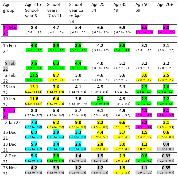 Proportion testing positive for SARS-CoV-2 in the two older age-groups rose to 5.6% at 16 March 2022 for citizens (such as me) aged 50-69 years and to 5.0% for 70+ year olds – worryingly higher, for this oldest age-group, than in any week since Omicron (BA.1 or BA.2) achieved dominance in UK.