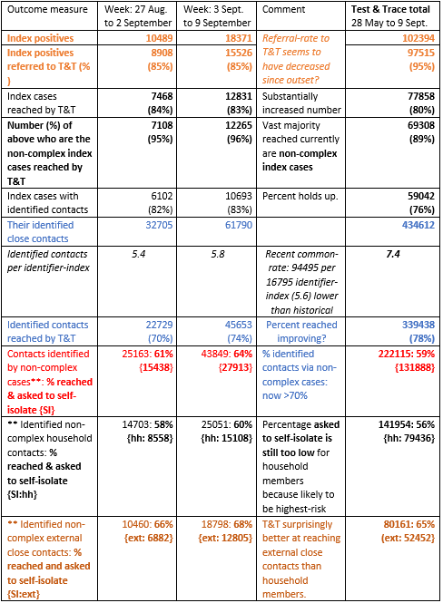 “Mid-September 2020 update: 82,000 symptomatic index cases had been transferred to T&T by 2 September 2020: 65,000 were reached but only 48,000 identified close contacts. Of 178,000 identified non-complex close contacts (61,000 external), only 104,00 were reached (39,600 external) and asked to self-isolate by T&T. Table add results for 3 to 9 September and end-to-end summary.