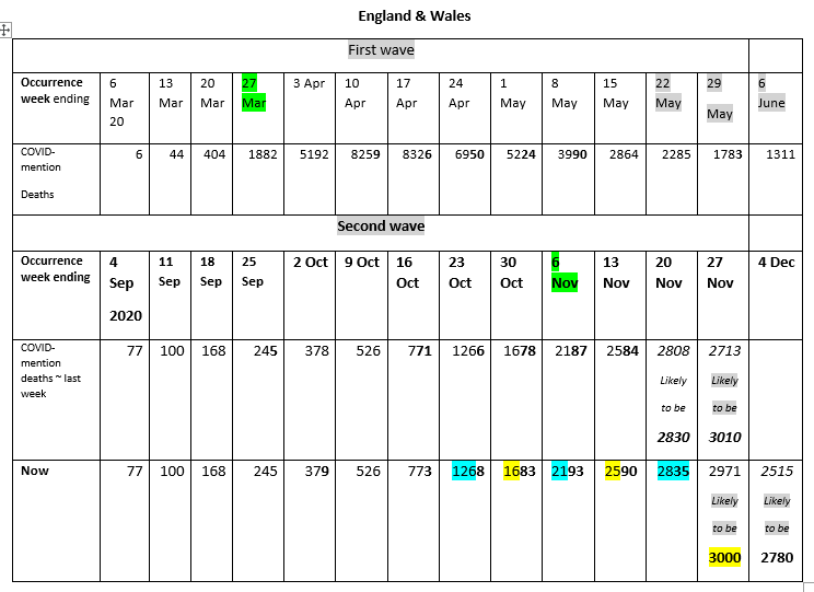“My table, updated from last week, shows COVID-mention deaths in England & Wales (by week of occurrence) from early September to early December 2020. The cumulative 2nd wave total of COVID-mention deaths that have occurred by 4 December is 18,600 (to the nearest 100).